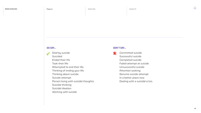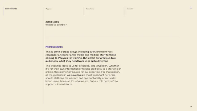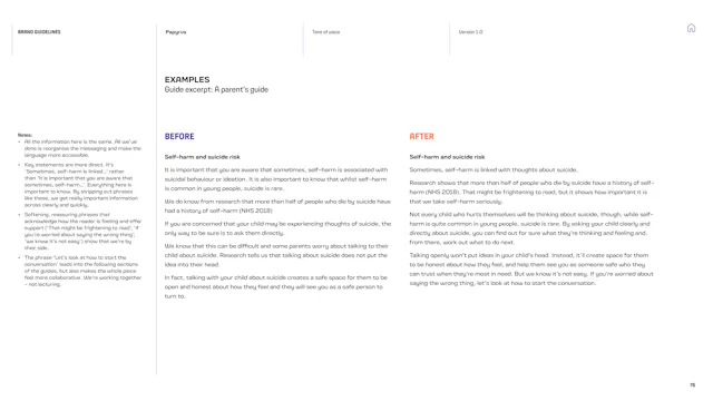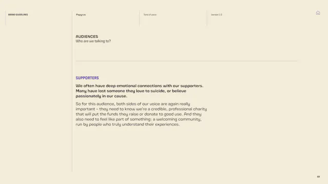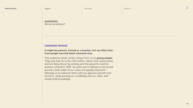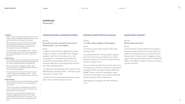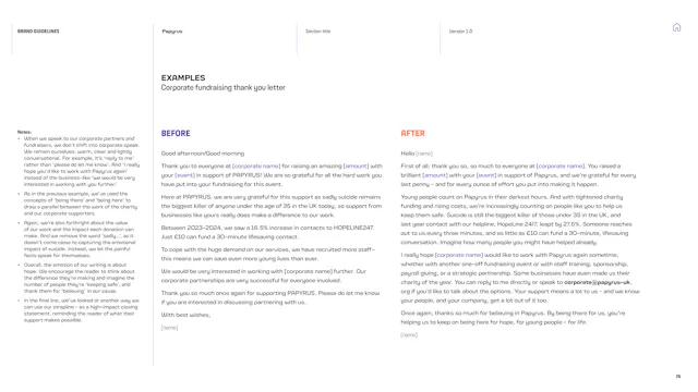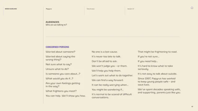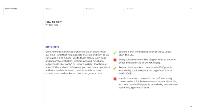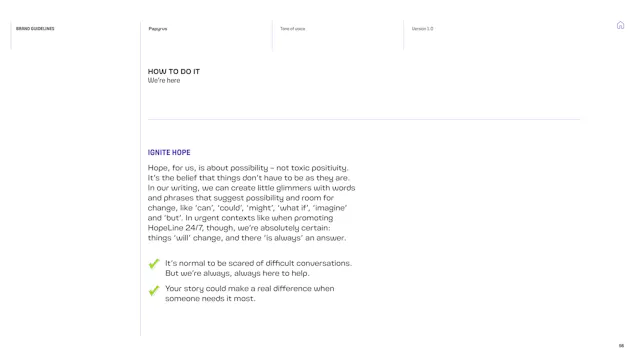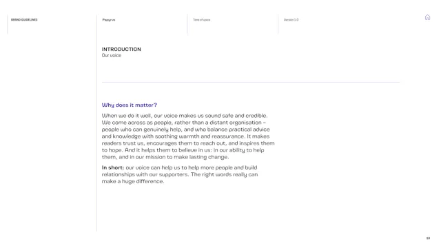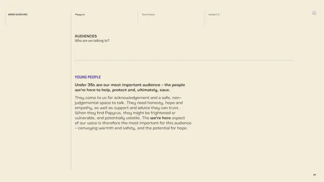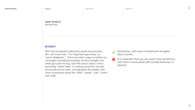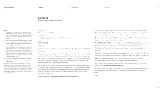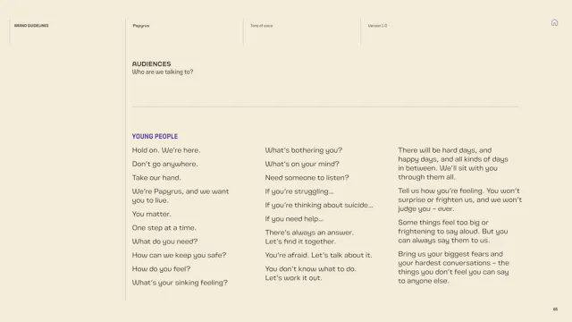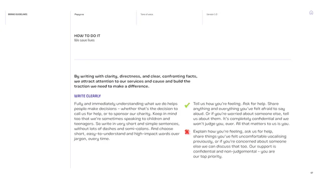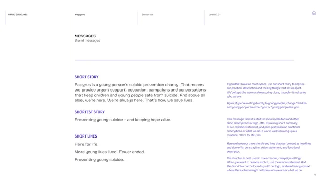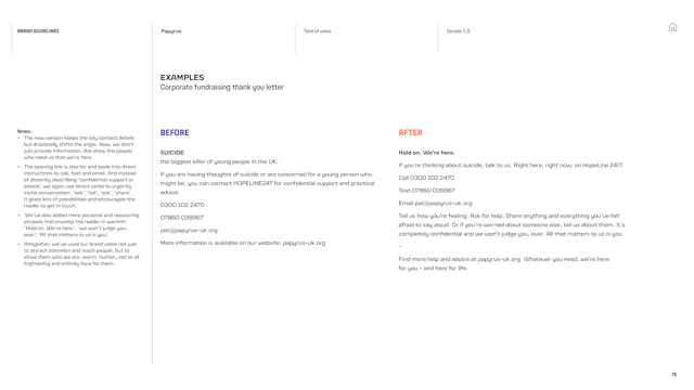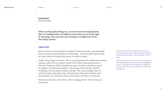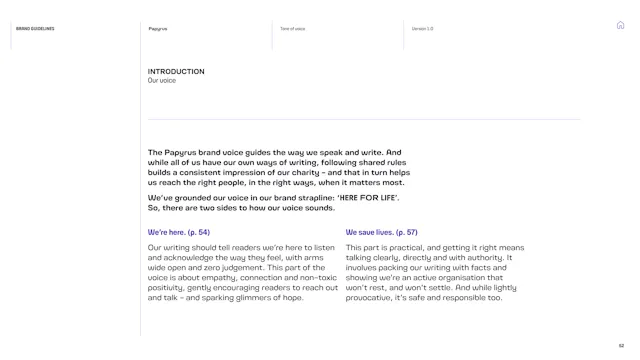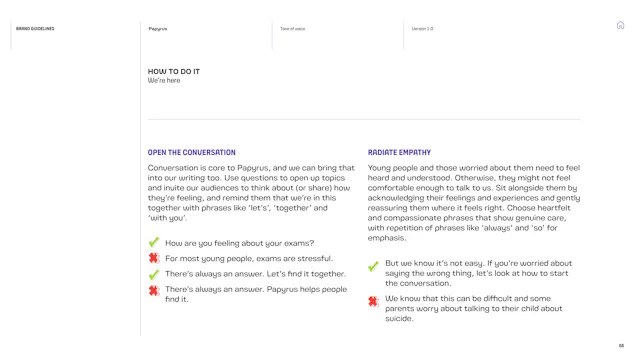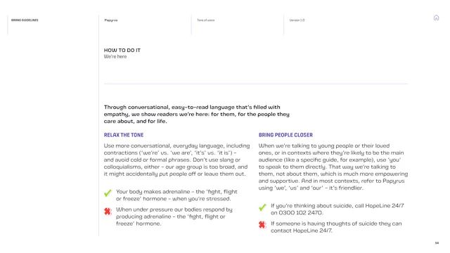 We built a framework that gives the Papyrus team the tools to communicate with young people in a way that is direct, human and supportive. That included detailed guidance on navigating the particular sensitivities of suicide and mental health language, which is a complex communication challenge in the charity sector. Content hierarchies, do’s and don’ts, and clear examples give the team the confidence to communicate consistently, whoever is writing.